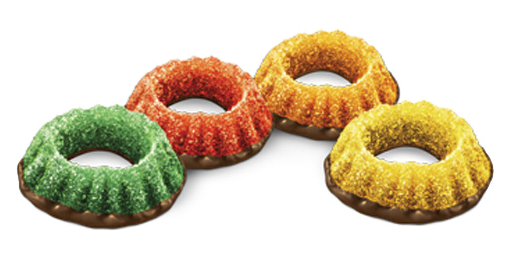 cukor, glukózový sirup, horká čokoláda 10% (kakaová hmota, cukor, kakaové maslo, emulgátor: sójový lecitín), želírujúca látka: pektíny, kyselina: kyselina citrónová , regulátor kyslosti: citrany sodné, farbivá: kurkumín , karmíny ,meďnaté komplexy chlorofylov a chlorofylínov; arómy malinová, pomarančová, citrónová a marhuľová. V horkej čokoláde kakaová sušina najmenej 54 %. Čokoláda môže obsahovať orechy.