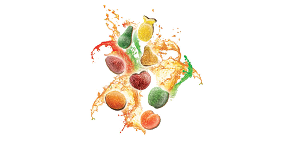 Ovocné želé 90% (ovocná zložka 50%: jablko, hruška, mandarínka, jahoda, višňa, figa, cukor, glukózový sirup, želírujúca látka: pektíny, kyselina: kyselina citrónová, regulátor kyslosti: citrany sodné, farbivá: kurkumín, karmíny, meďnaté komplexy chlorofylov a chlorofylínov, arómy), horká čokoláda 10% (kakaová hmota, cukor, kakaové maslo, emulgátor: sójový lecitín). V horkej čokoláde kakaová sušina najmenej 54%. Čokoláda môže obsahovať orechy.