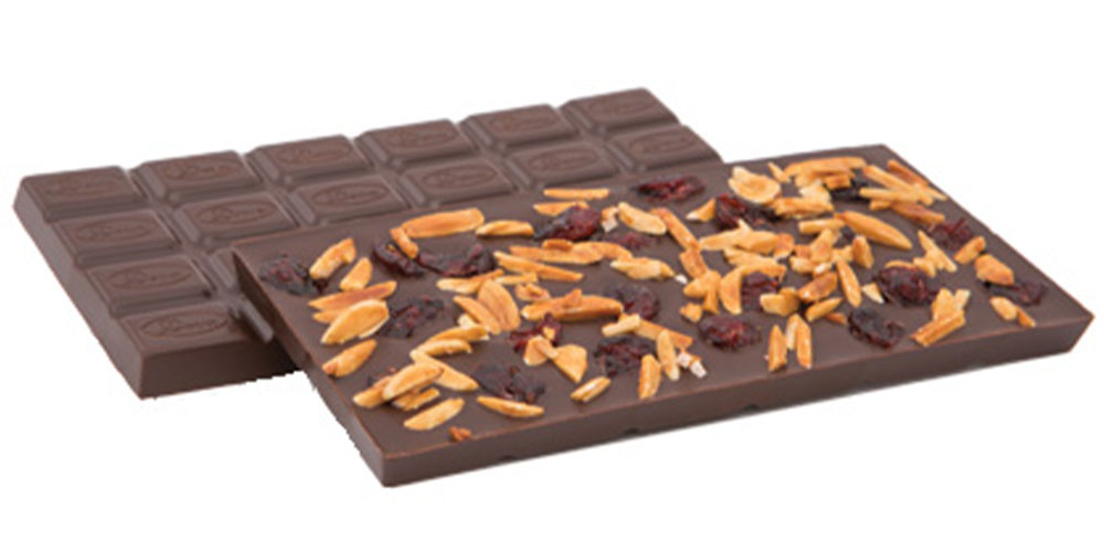 Horká čokoláda 84% (kakaová hmota, cukor, kakaové maslo, emulgátor: sójový lecitín), pražené mandle karamelizované (mandle, cukor, glukózový sirup, med) a presladená kľukva (kľukva, cukor, kyselina citrónová, malinová aroma, bazový koncentrát, slnečnicový olej). V horkej čokoláde kakaová sušina najmenej 54%. Výrobok môže obsahovať iné orechy a glutén.