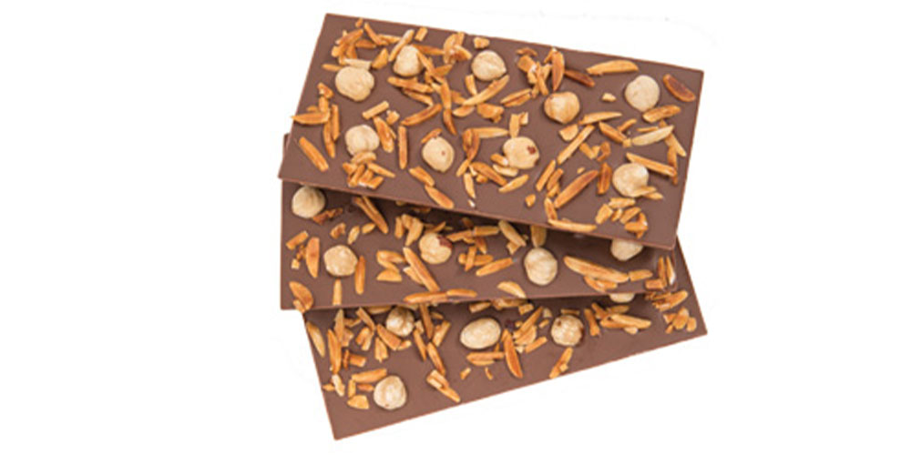 Mliečna čokoláda 84% s posypom 16% (pražené mandle sekané a pražené lieskové oriešky).