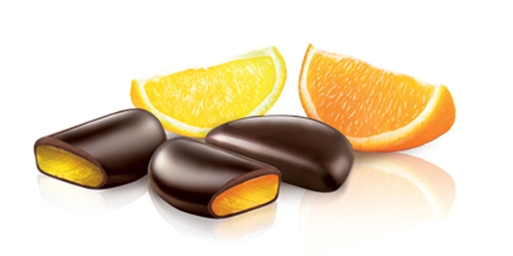 cukor, horká čokoláda 30% (kakaová hmota, cukor, kakaové maslo, emulgátor: sójový lecitín), glukózový sirup, želírujúca látka: pektíny, kyselina: kyselina citrónová, regulátor kyslosti: citrany sodné, farbivá: kurkumín a karmíny, aróma pomarančová a citrónová. V horkej čokoláde kakaová sušina najmenej 54%. Čokoláda môže obsahovať orechy.